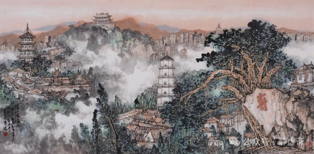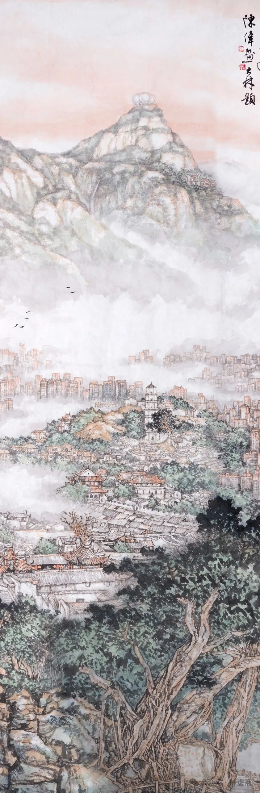 "三山两塔一条江"见证了福州的沧桑巨变,也成为陈伟笔下的常见主题。他常以全景式构图,巧妙地将这些地标性景观融入画中。画面大开大合处顾盼有致,精微细节处相互呼应。山峦起伏,江水潺潺,每一笔每一画都透露出画家对这片土地的深厚感情。画中的三山,宛如三位各具风情的诗人,静立于福州城的怀抱之中,诉说着千年的故事;两塔如伴侣般伴随福州城的成长;镇海楼则如威严又不失慈祥的老者俯瞰全城,见证沧海桑田。远处山水隐约,消融于海天之间。近景中遒劲的古榕树枝繁叶茂,如同一把巨大的绿伞,庇护着榕城的人民,阳光透过茂密的树叶,洒在古老的街巷上,映射出古城的静谧与和谐。