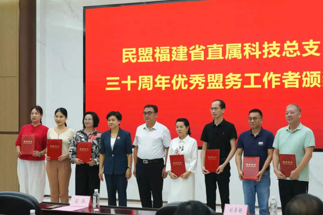 会议对科技总支“优秀盟员”“优秀盟务工作者”和“突出贡献者”进行表彰,并举行新盟员入盟仪式。获奖盟员、新盟员、联络员代表分别发言。民盟福建省直属经济总支主委翁陈岚作为省直基层组织代表致辞。