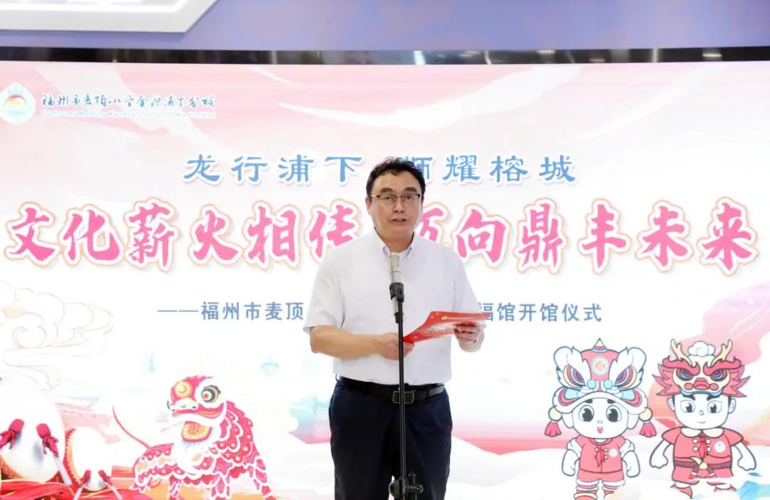 刘泓在开馆仪式上致辞。他说,为传承优秀传统文化,以时代精神激活“福”文化的生命力,2022年,在民盟省委会的指导协调下,金源浦下小学成功申报建设福建省校园“福”文化建设项目。希望学校全校师生初心如磐,矢志不渝,传承先贤功业,担当时代责任,以“承民族文化,做龙的传人”办学理念,将办学愿景与地域文化相结合,擦亮“福馆”等校园文化品牌,努力实现“办成东部一所示范性优质小学”办学目标。