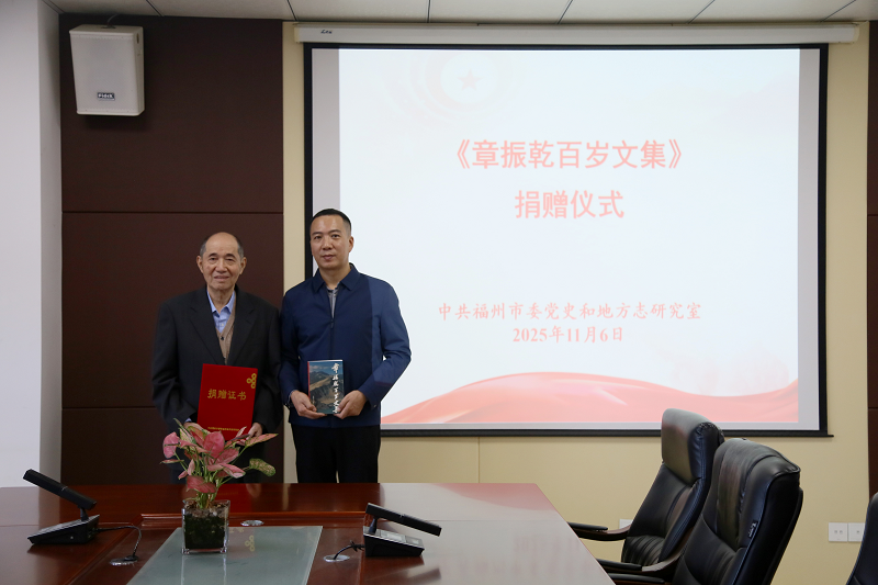2025年11月6日,章振乾之子章重先生(上图左一)向中共福州市委党史和地方志研究室捐赠了一批文献资料,其中就包括《章振乾百岁文集》一书。