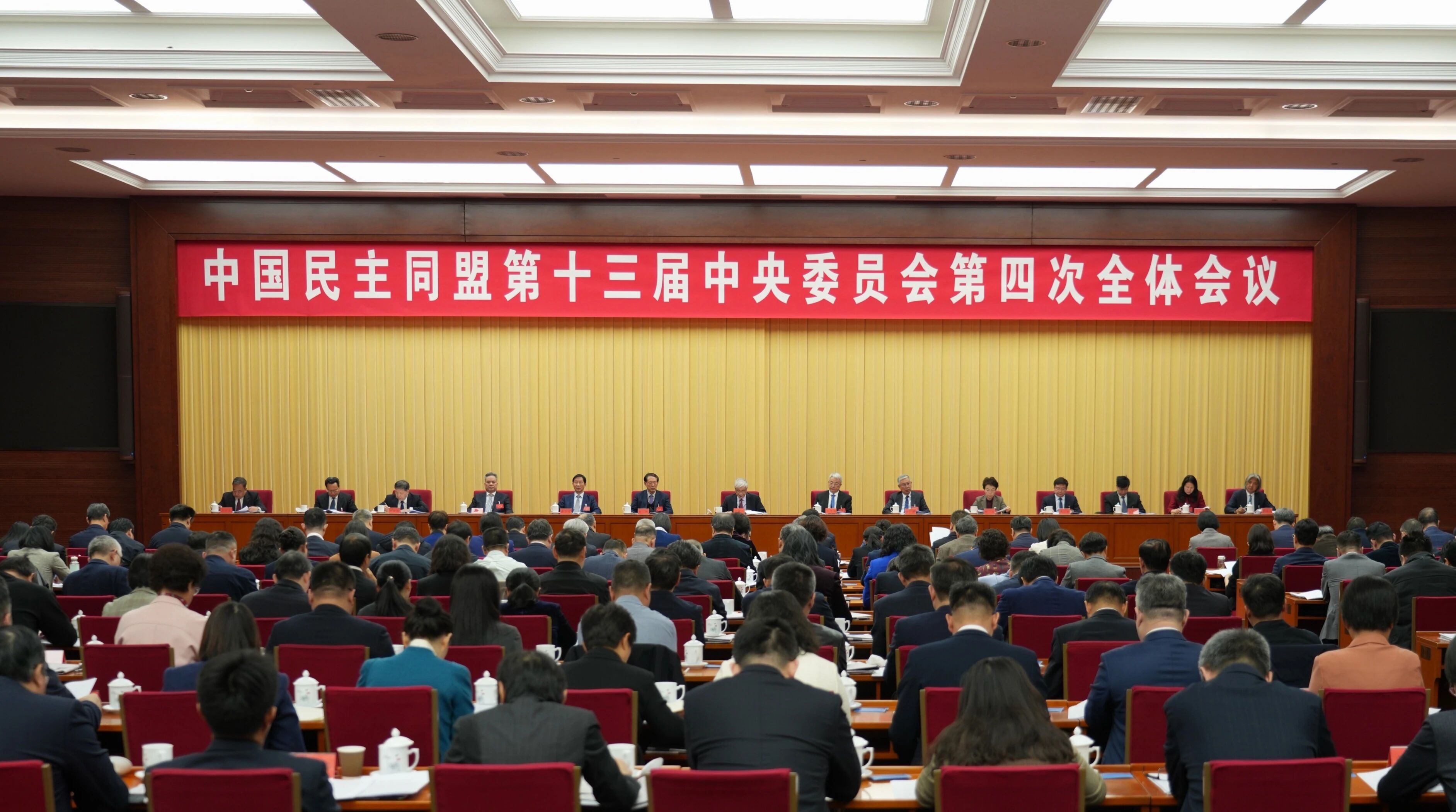 民盟中央主席丁仲礼代表民盟第十三届中央常务委员会作工作报告,民盟中央常务副主席王光谦主持开幕会。民盟中央副主席徐辉、田刚、曹卫星、程红、张道宏、陈群、邓秀新、郑功成、谢经荣、霍金花、王学成、吴为山出席会议。