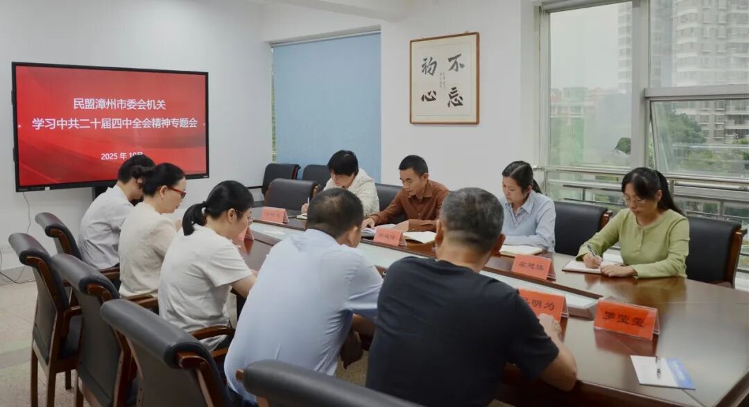 10月28日,民盟漳州市委会机关召开学习中共二十届四中全会精神专题会。会议学习了《中国共产党第二十届中央委员会第四次全体会议公报》,传达学习中共福建省委常委(扩大)会、中共漳州市委常委会(扩大)会、中共漳州市委统战部部务会(扩大)会有关会议精神。